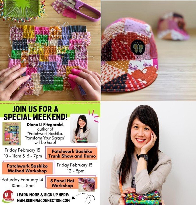 Diana Li Fitzgerald, the artist behind Banjoflannel, will present samples and a demonstration from her new book, “Patchwork Sashiko: Transform Your Scraps” from C&T Publishing. The beauty and texture of her Patchwork Sashiko Method is created through a unique mash-up of different slow stitching and patchwork techniques. This method produces a textile you can use in any of your favorite projects; bags, clothing, quilts, etc. Come to the trunk show and get your own signed copy of the book! You’ll want to try this method for yourself with your own beautiful scraps. Interested in taking a workshop? Grab lunch after the first trunk show, then come back at noon for the Patchwork Sashiko Workshop!-order and pay for Diana's